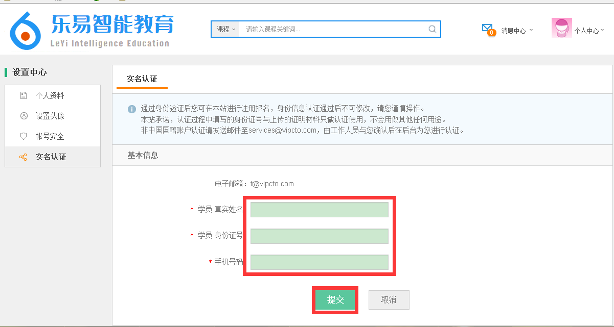 输入真实有效的身份信息,点击“提交”按钮将提示用户输入手机验证码,数据手机接收到的验证码进行认证。