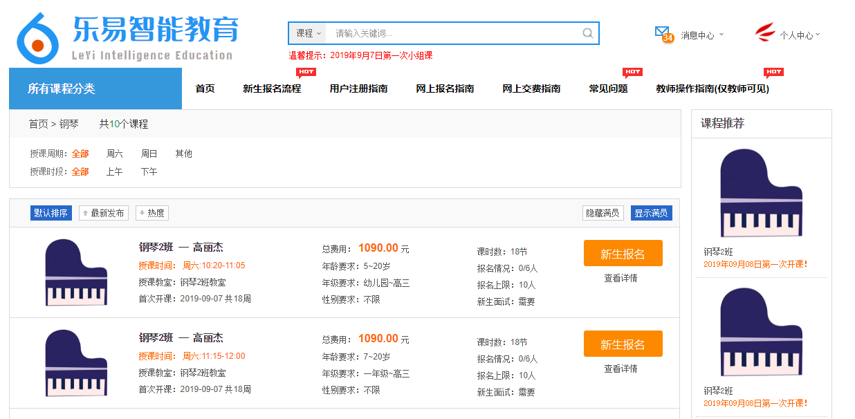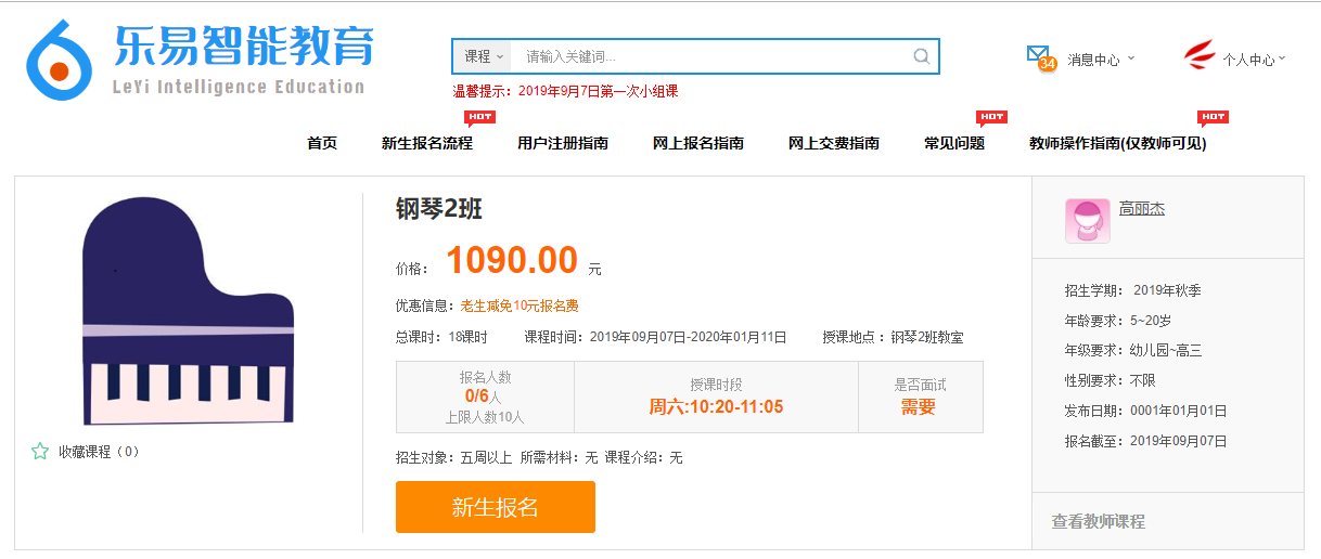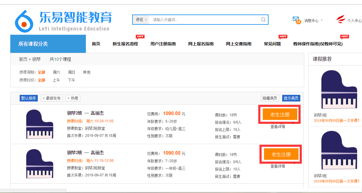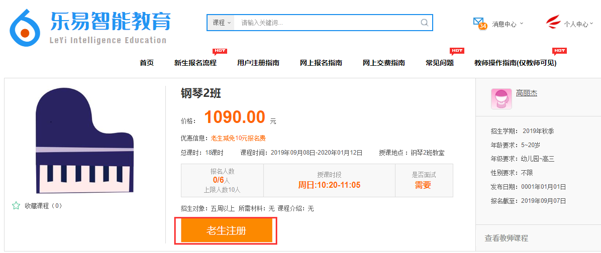 您可以直接点击"新生报名"按钮进行老生注册,也可以点击"查看详细"进入课程详细信息页面,进行"新生报名"
